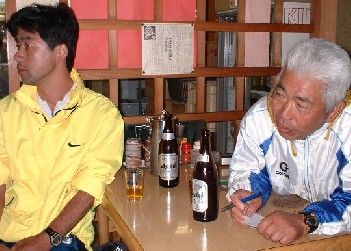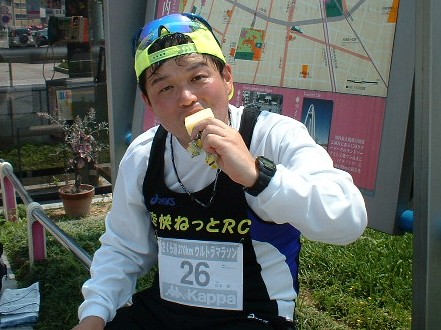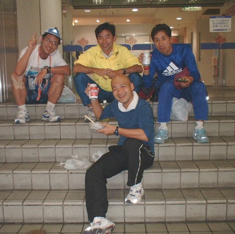 2階へ上がるとリタイアされたランナー、仮眠をとられているランナー等いろいろいらっしゃった中でやはり目立ったのは「スキンヘッド」のマッちゃん。「お疲れさん。止め?」と。90キロのエイドでの表情からは一変していつものマッちゃんの戻っていてホッとする。隣にはコーチャンが。「リタイアです」と言うと、「一旦名古屋へ引き返して金沢へ行こうと思ってんねん」と。