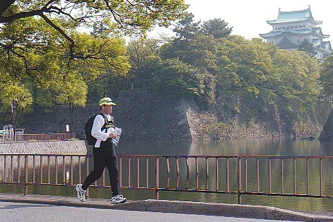 10キロ地点(8時20分くらい)名古屋城をバックにした写真です。リュックが重そ〜!